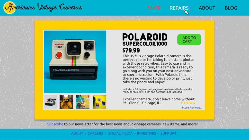 This website layout was designed as part of a challenge to produce a product page with a review, additional photos, and product description. It was made in 30 minutes as part of a timed challenge. I wanted to use colors and type that offer a sense of nostalgia and match the feel of the Polaroid design.