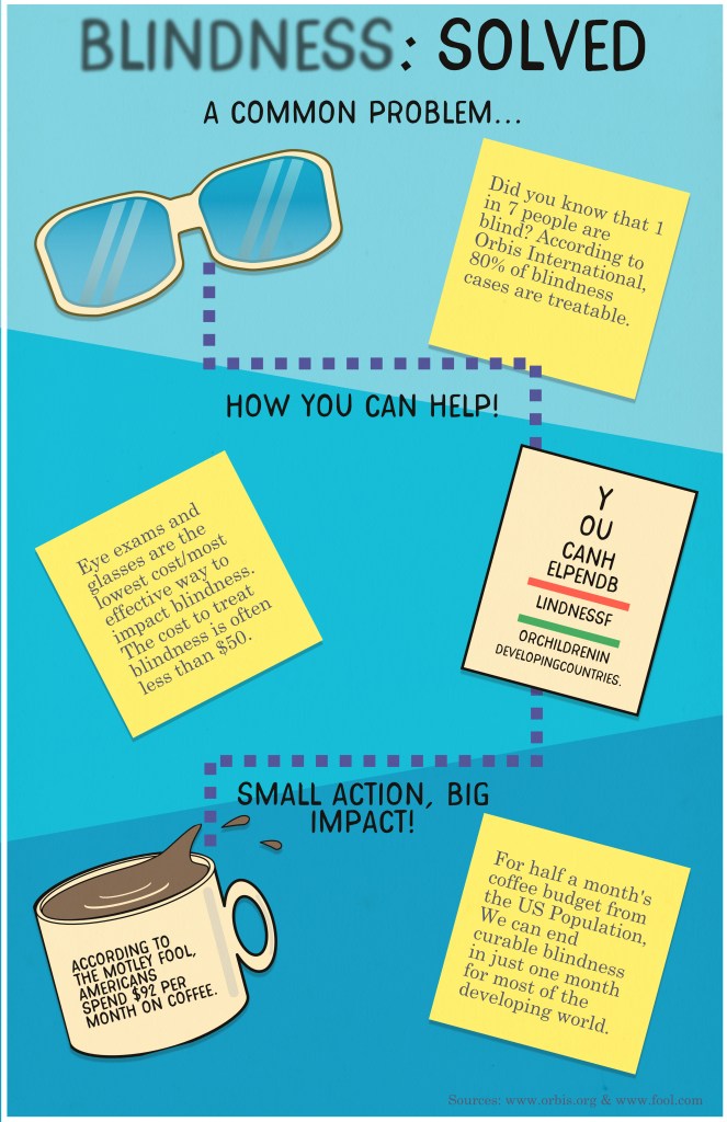 The goal of this poster design is to educate a target audience that blindness is a significant but mostly solvable problem. From a wide explanation of the problem, I used copy and vector illustrations to lead the audience to a specific solution which include a cost that most U.S. citizens could afford to help end poverty related blindness. I wanted the headline to draw attention with the blurriness of the word Blindness, and intrigue the viewer by offering a solution. On the eye exam chart, there is a statement “You can help end blindness for children in developing countries”.