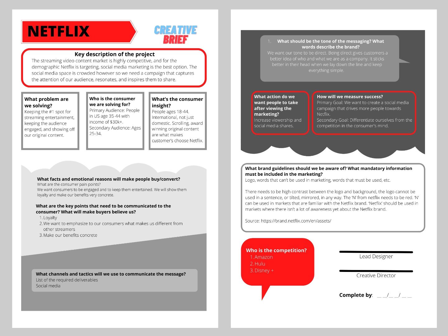 Teamwork: The creative brief below is the result of a team effort by Cece Castillo, Hannah Sullivan, and myself. Each member was tasked with researching a portion of the Goals, Objectives, Strategies, and Tactics. Then I put together our findings in this layout, chose the design elements, and colors that match the Netflix Branding. Our target audience is the CMO and Creative team of Netflix. Our Goal is to express that social media marketing is the best strategy and use of marketing budget for the year. You can reach Cece Castillo on her site http://www.ceceliacastillo.com and Hannah at hannah.s.sullivan@wsu.edu.